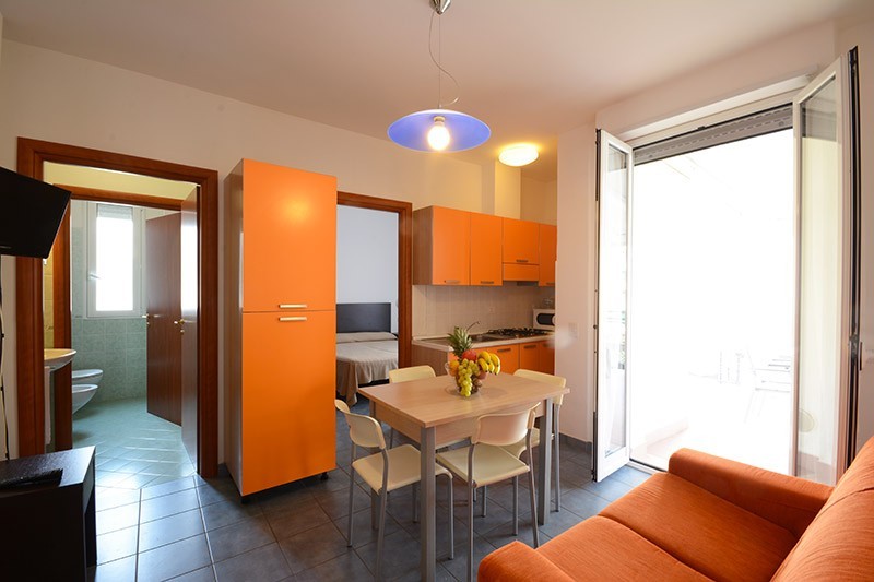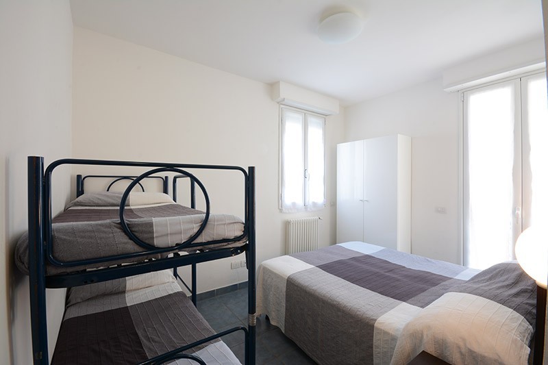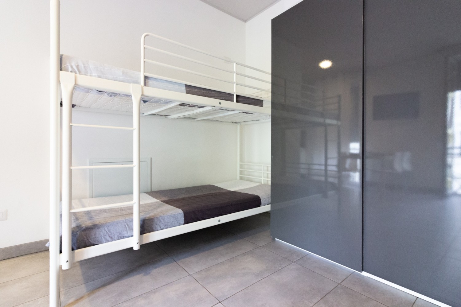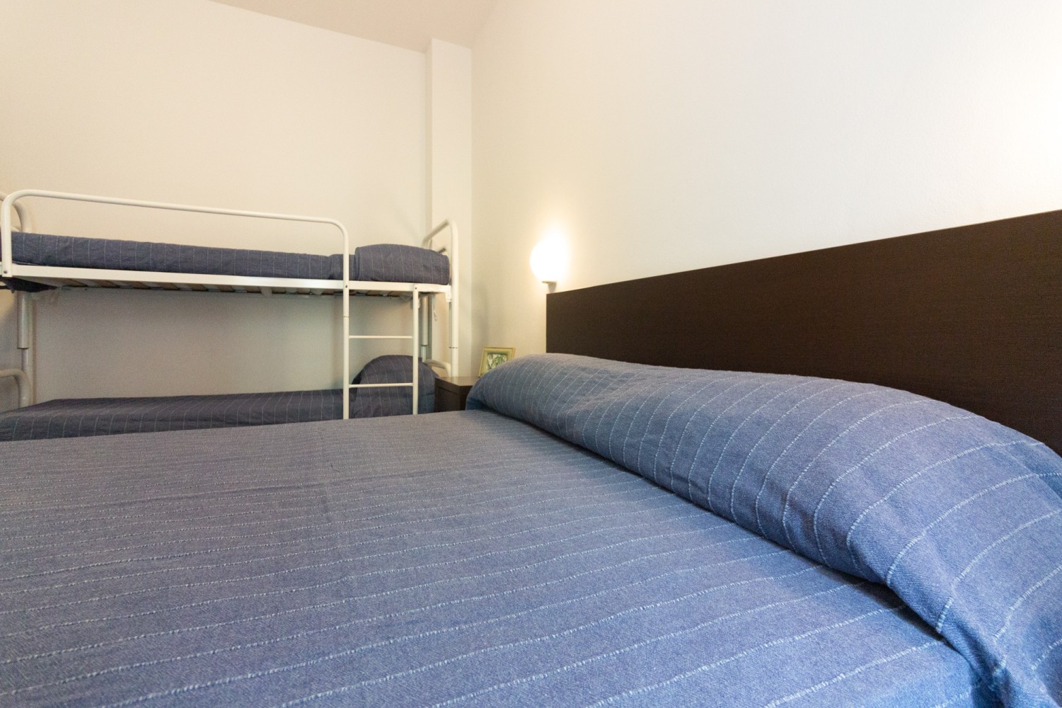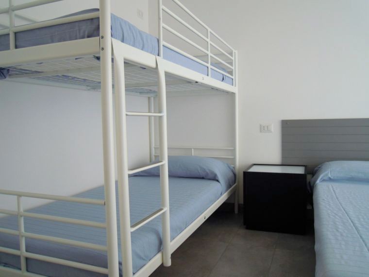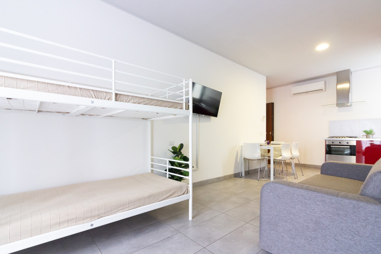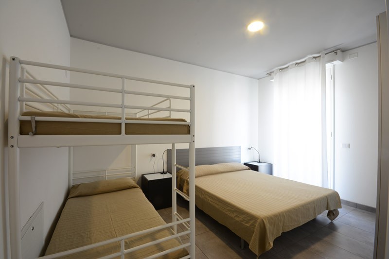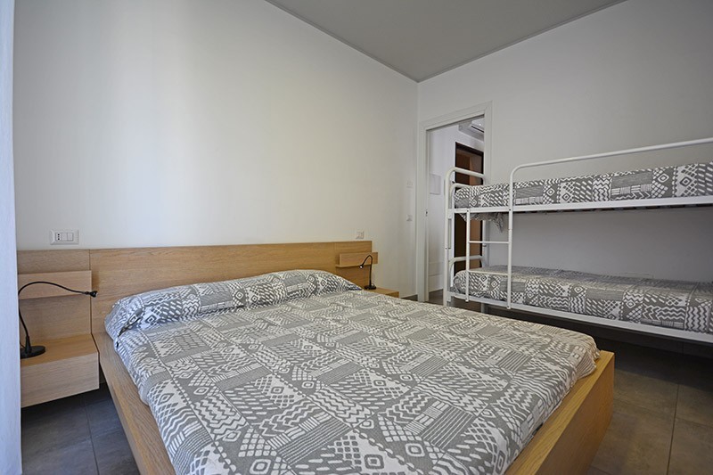 Composto da una camera matrimoniale con letto a castello, un soggiorno con divano letto e cucina attrezzata, un bagno moderno, con antibagno e box doccia, e balcone.