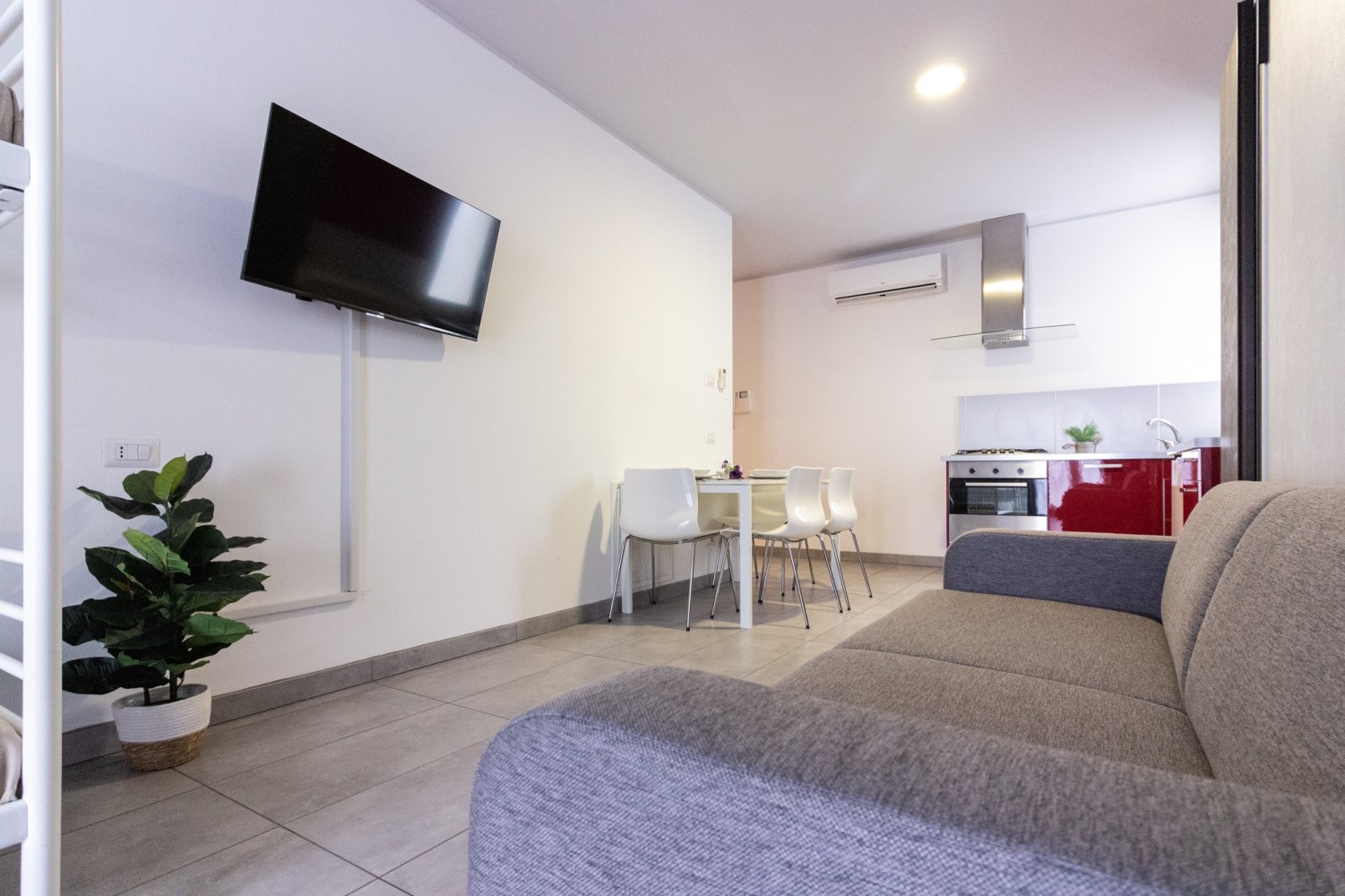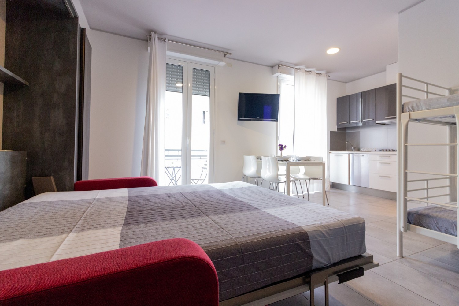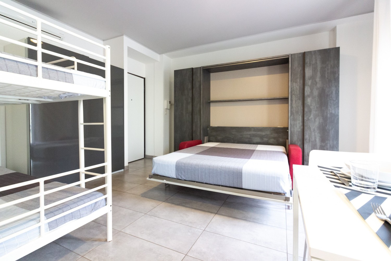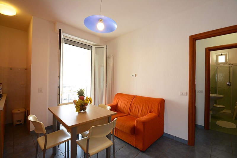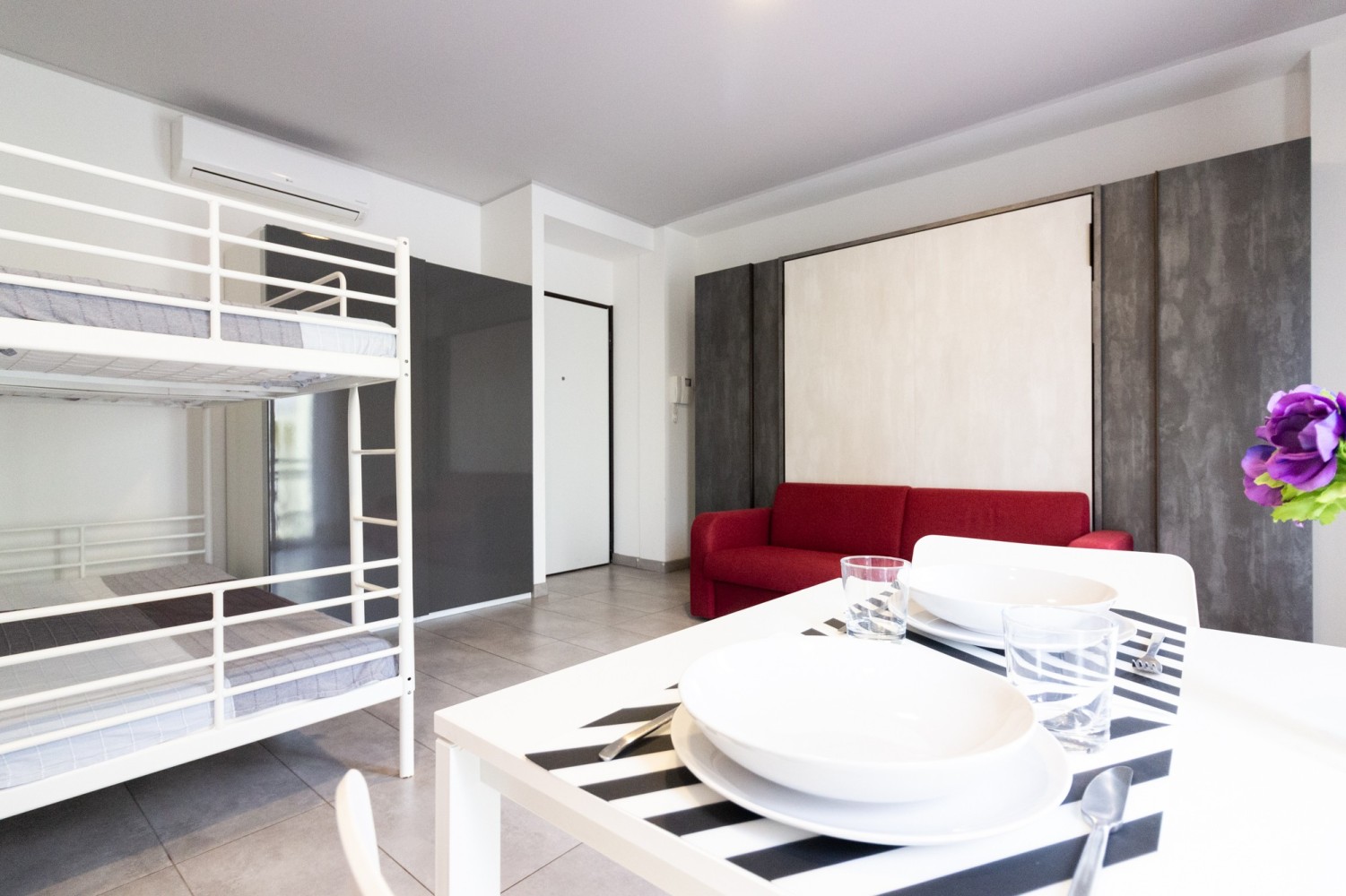Composto da una camera matrimoniale con letto a castello, un soggiorno con divano letto e cucina attrezzata, un bagno moderno, con antibagno e box doccia, e balcone.