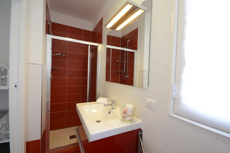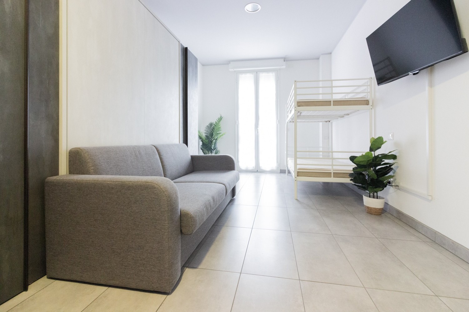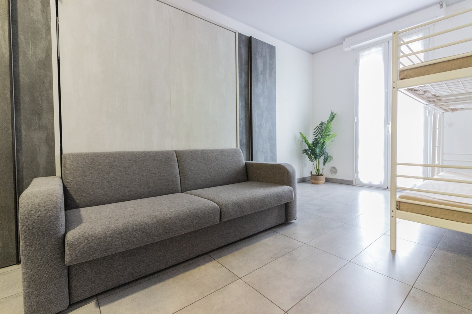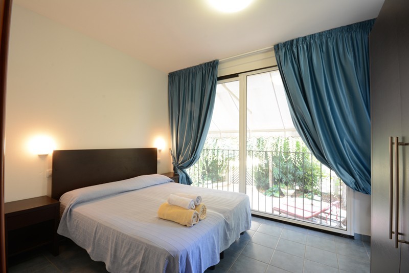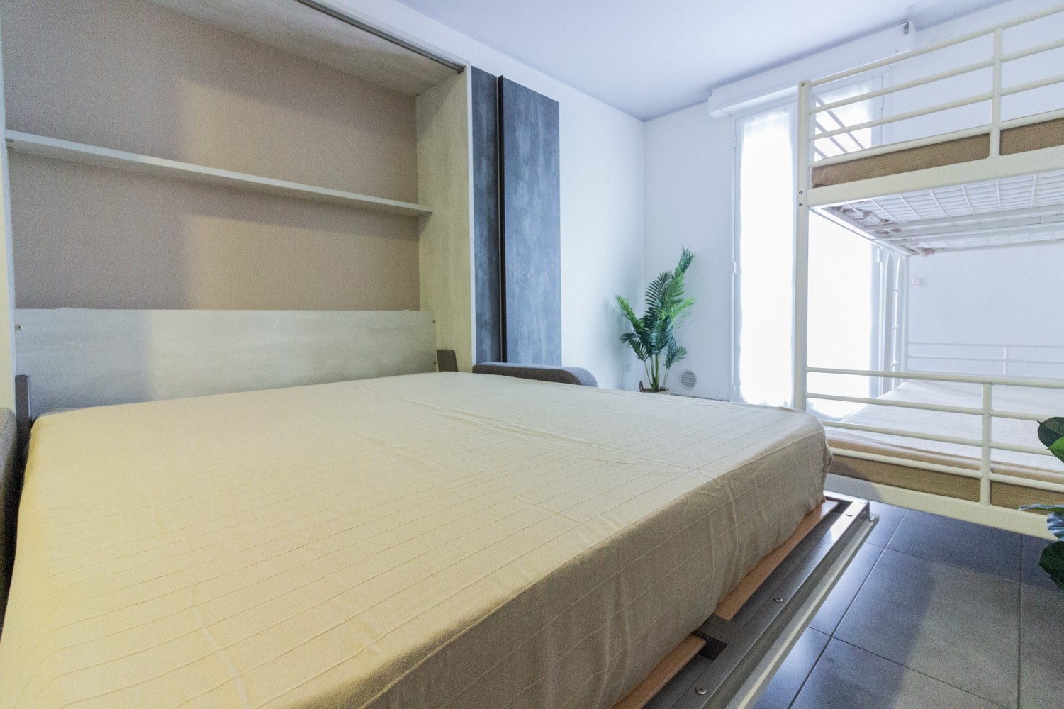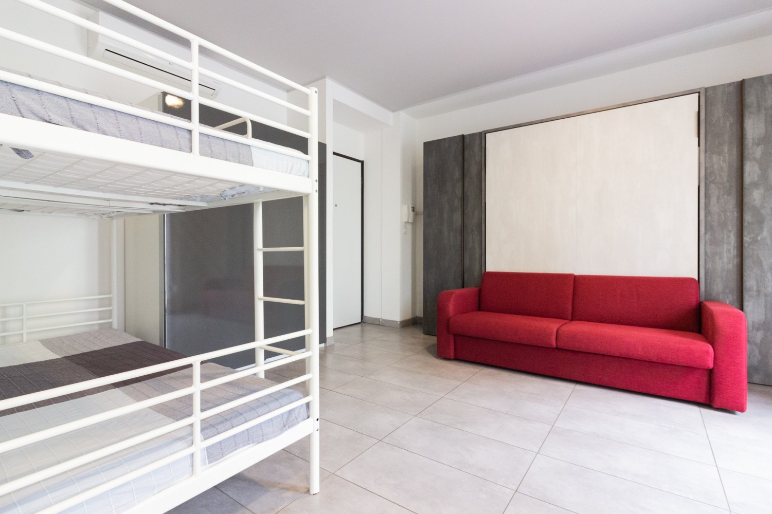 Composto da una camera matrimoniale con letto a castello, un soggiorno con divano letto e cucina attrezzata, un bagno moderno, con antibagno e box doccia, e balcone.