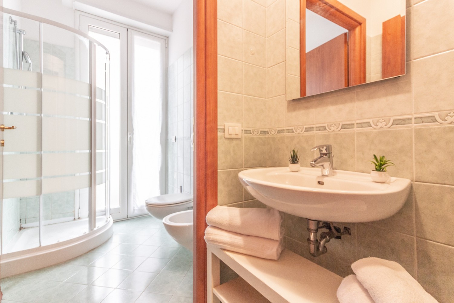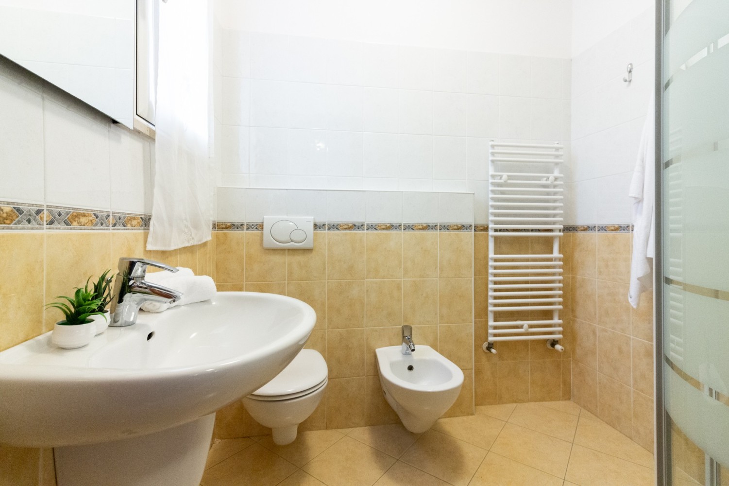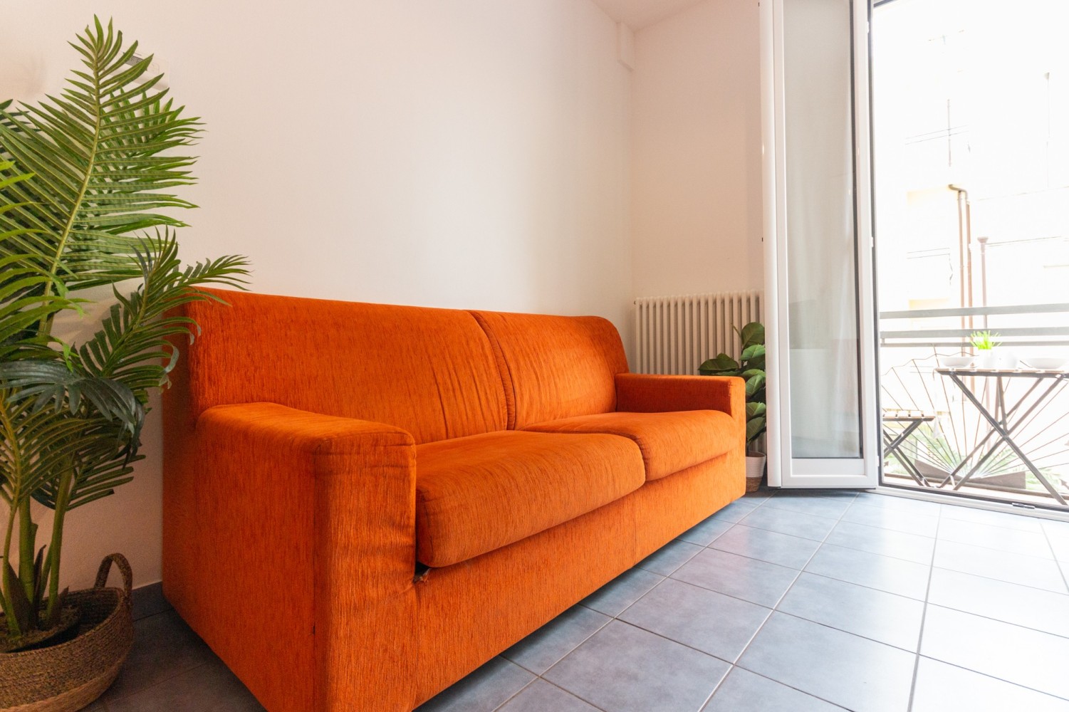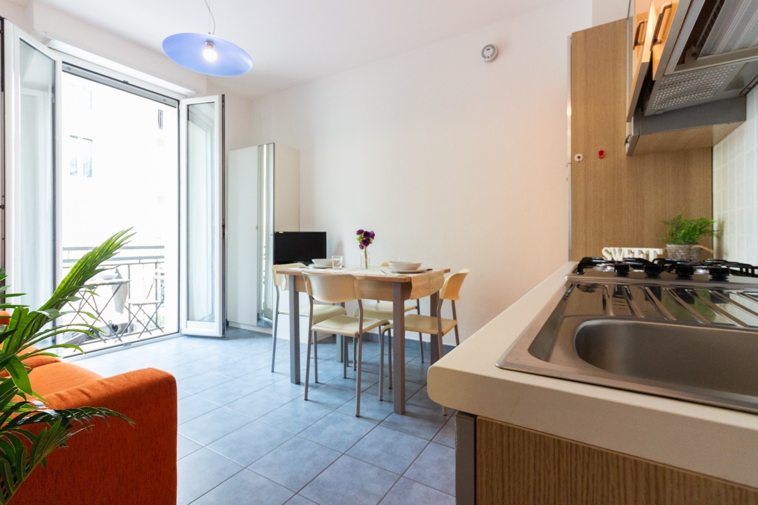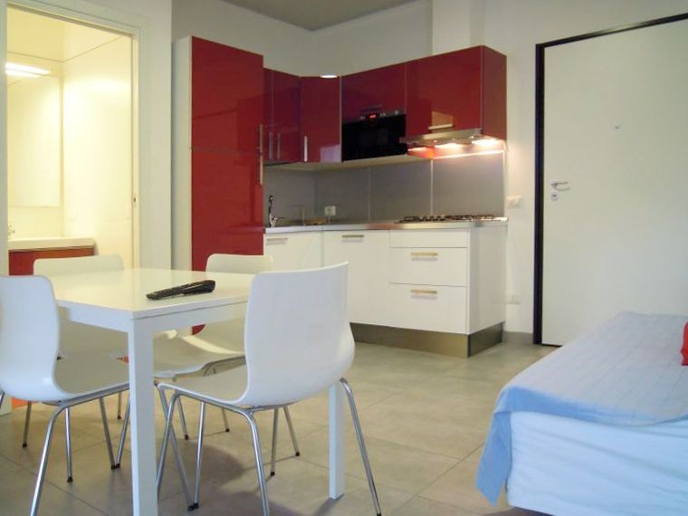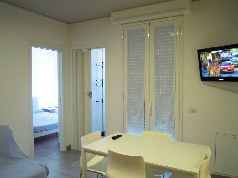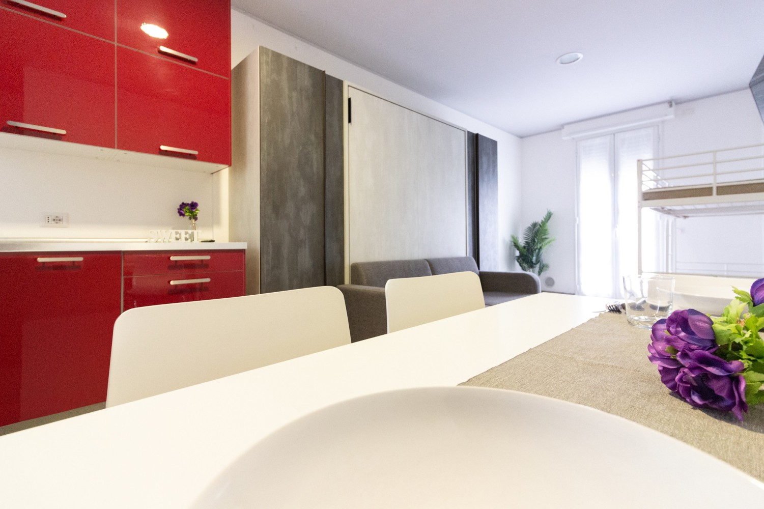 Composto da una camera matrimoniale con letto a castello, un soggiorno con divano letto e cucina attrezzata, un bagno moderno, con antibagno e box doccia, e balcone.