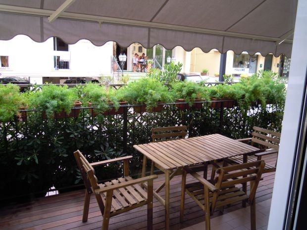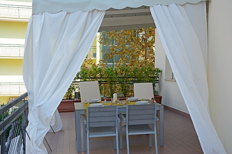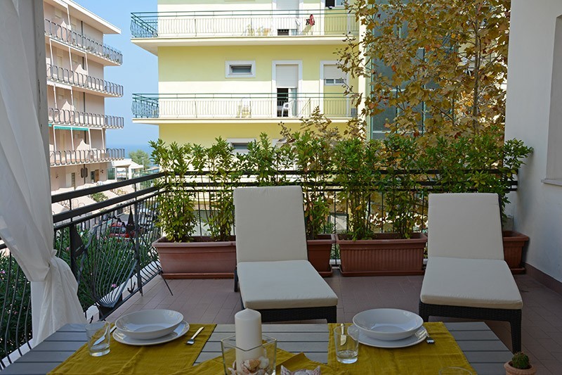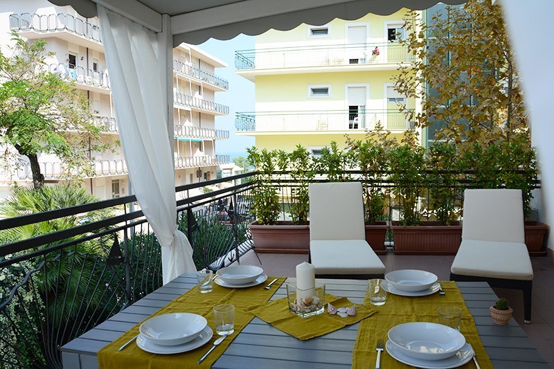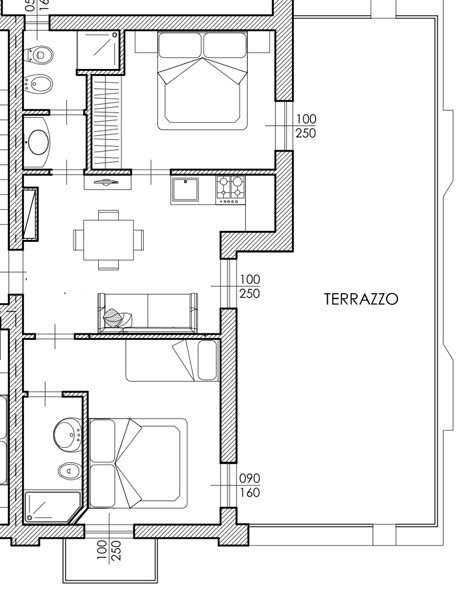 Soggiorno angolo cottura attrezzato, due camere matrimoniali, doppi servizi con antibagno e box doccia. Terrazzo solarium privato attrezzato di 50 mq. con possibilità di pranzare all'aperto sotto la veranda.