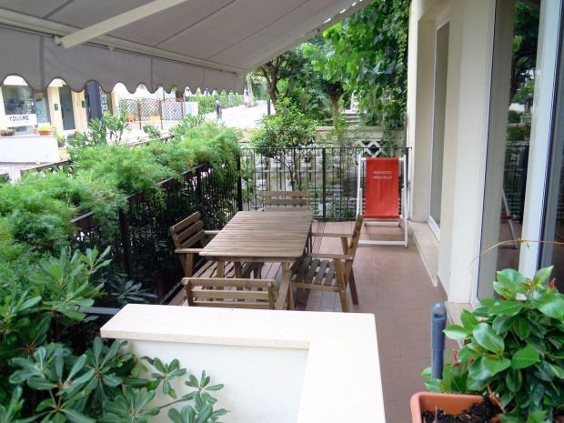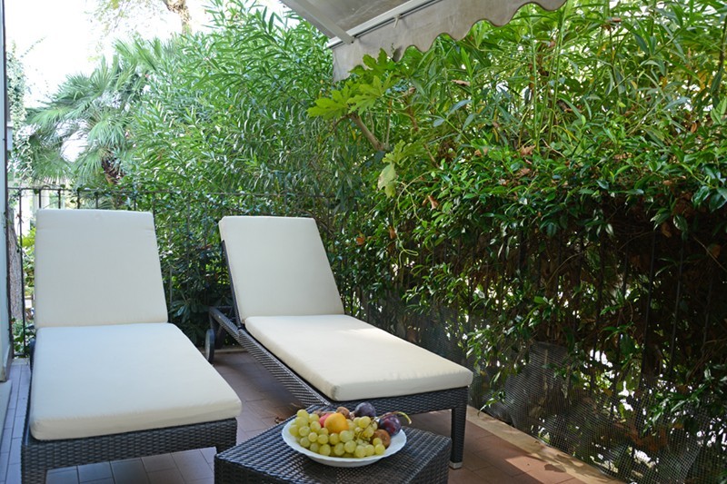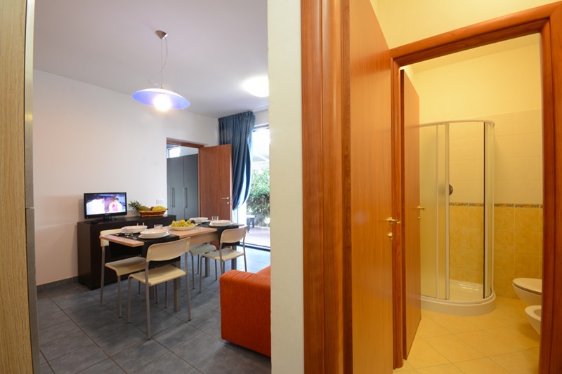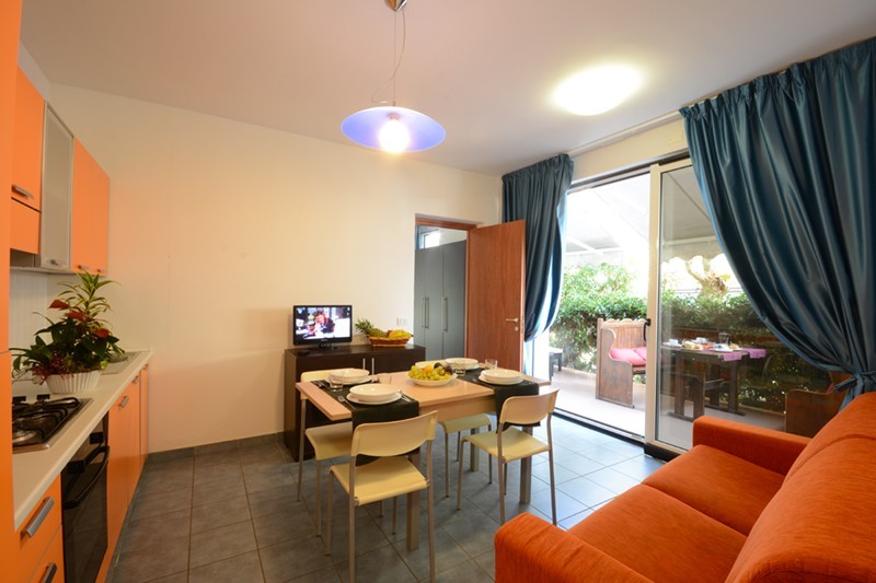 Situato al piano terra è composto da una camera matrimoniale con affaccio sul giardino, un soggiorno con letto matrimoniale a scomparsa e un bagno moderno con antibagno e box doccia. In più dispone di terrazza esterna privata con tavolo, sedie e lettini prendisole.